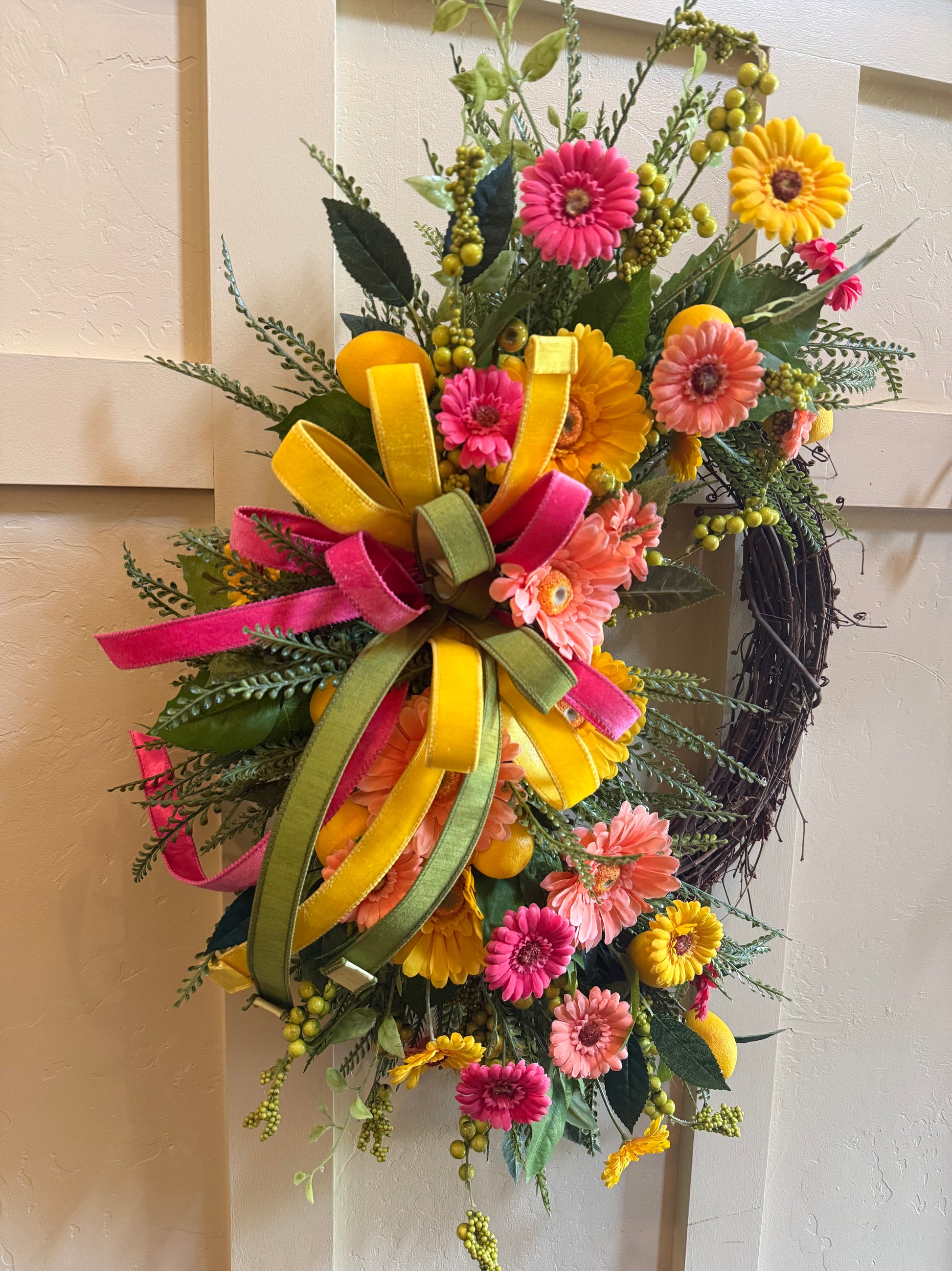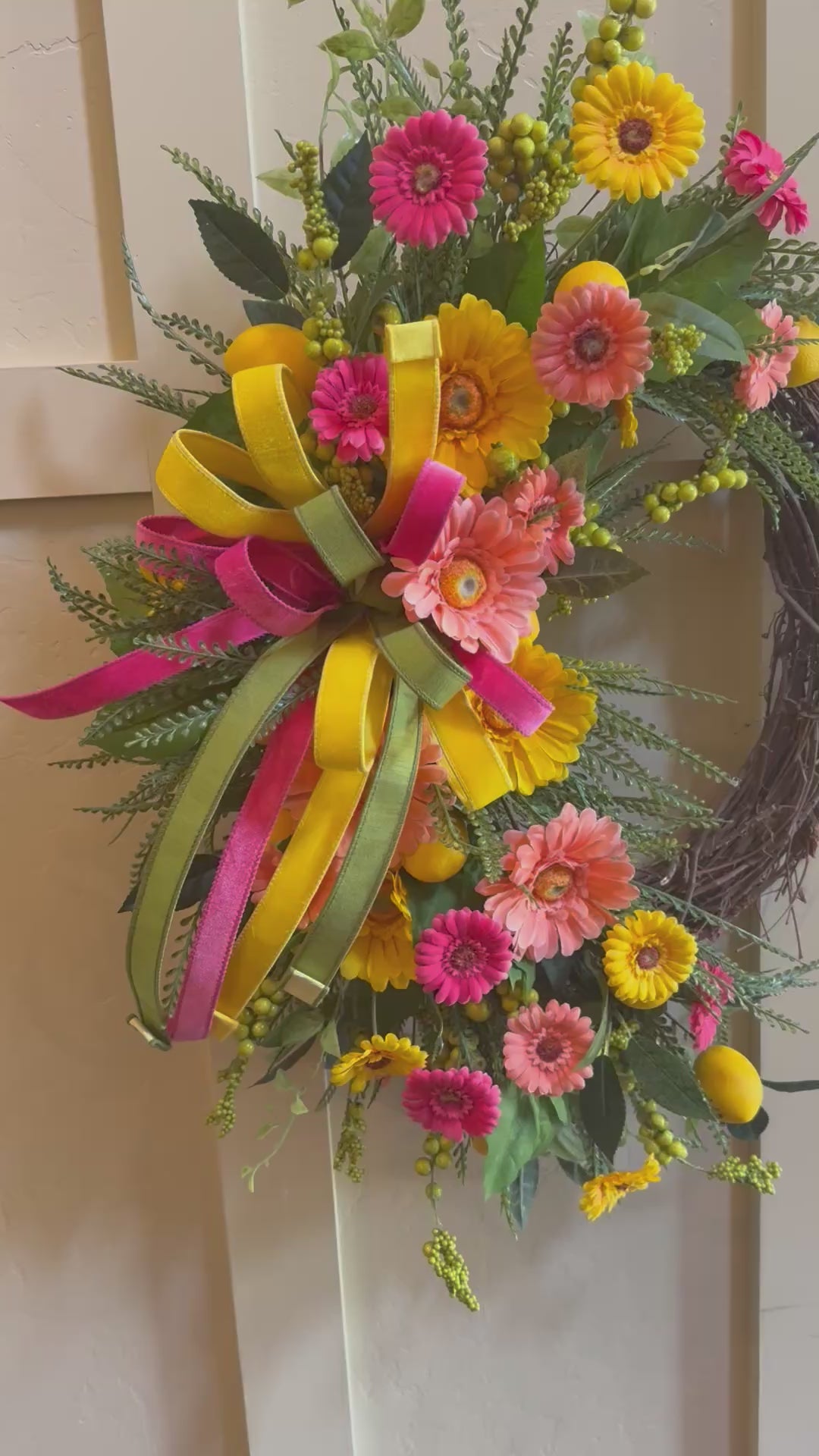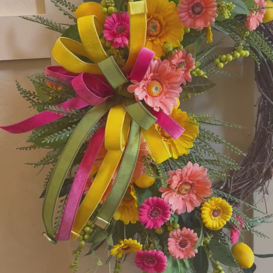 This is a finished product. This showstopper wreath is absolutely gorgeous with beautiful florals and lemons and gorgeous luxury ribbons. Made on a 22 inch oval grapevine
