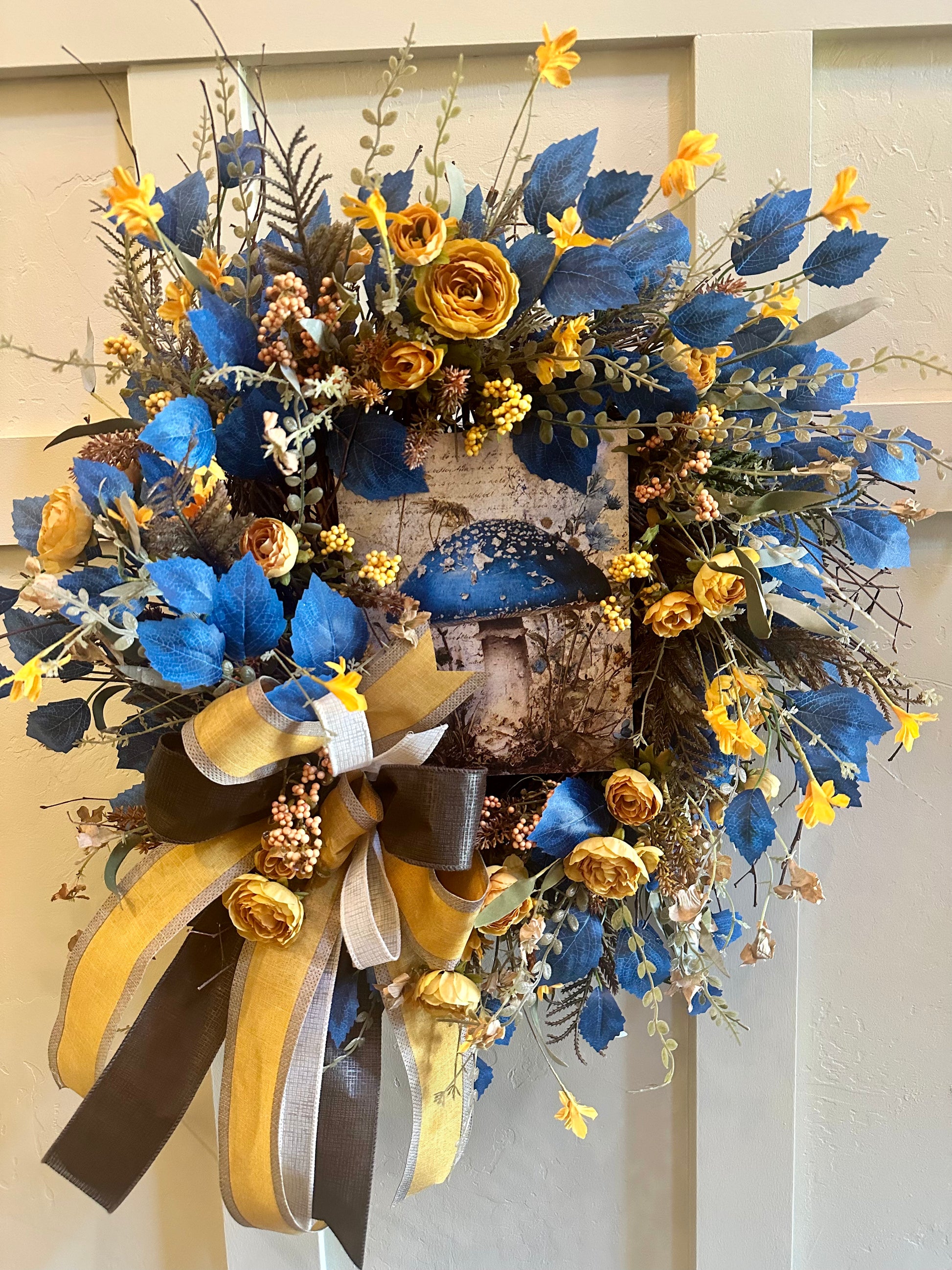 This is a finished wreath. This wreath is made on a round grapevine and the finished wreath is approximately 30 inches around tip to tip. It’s filled with blue and yellow filler bushes and blue ficus leaves along with an exclusive sign from on a Whimm signs.
