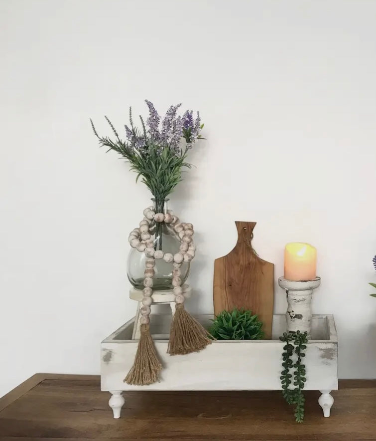 Made of solid pine with a rustic finish. Measures 19”L x 9.75”W x 8”H
