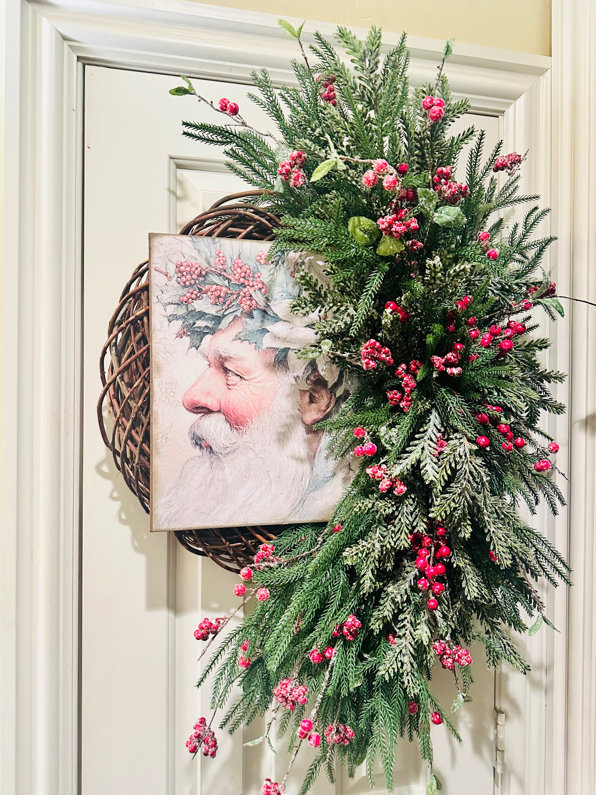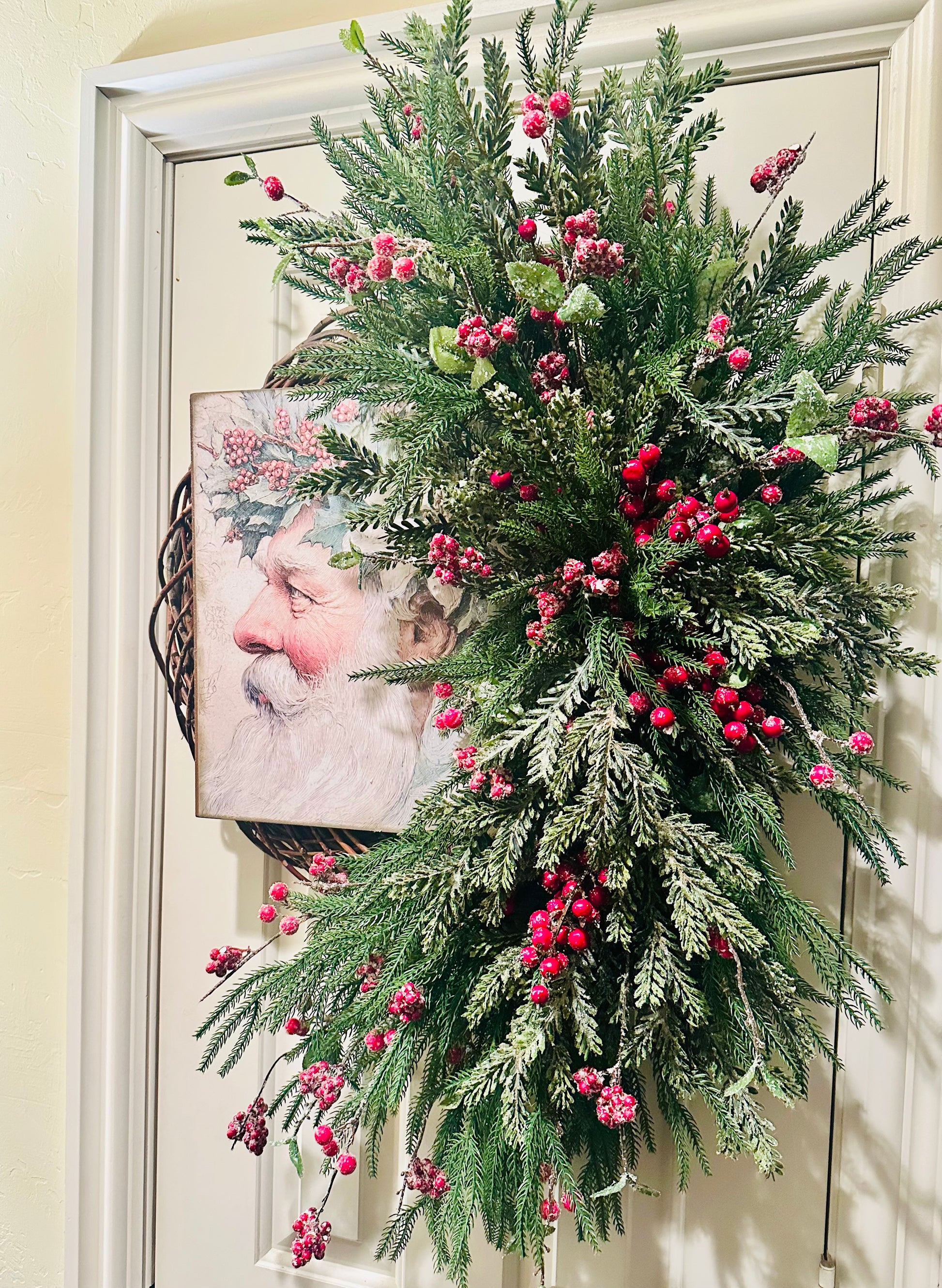This wreath was a designed on an 18” round willow wreath. The sign is exclusive to my shop and is 11x14. Norfolk pine and berries make this a classic design that you can use for many many years.